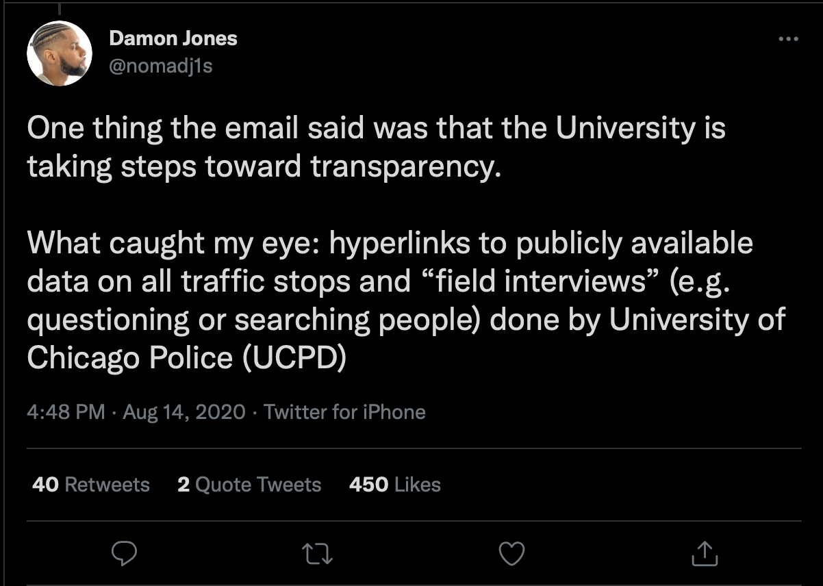 Follow the tweet thread and you’ll see how Professor Damon Jones, of Harris, prepares and analyzes his data. In this lab, you’re going to follow his lead and dig into traffic stop data from the University of Chicago Police Department, one of the largest private police forces in the world.
