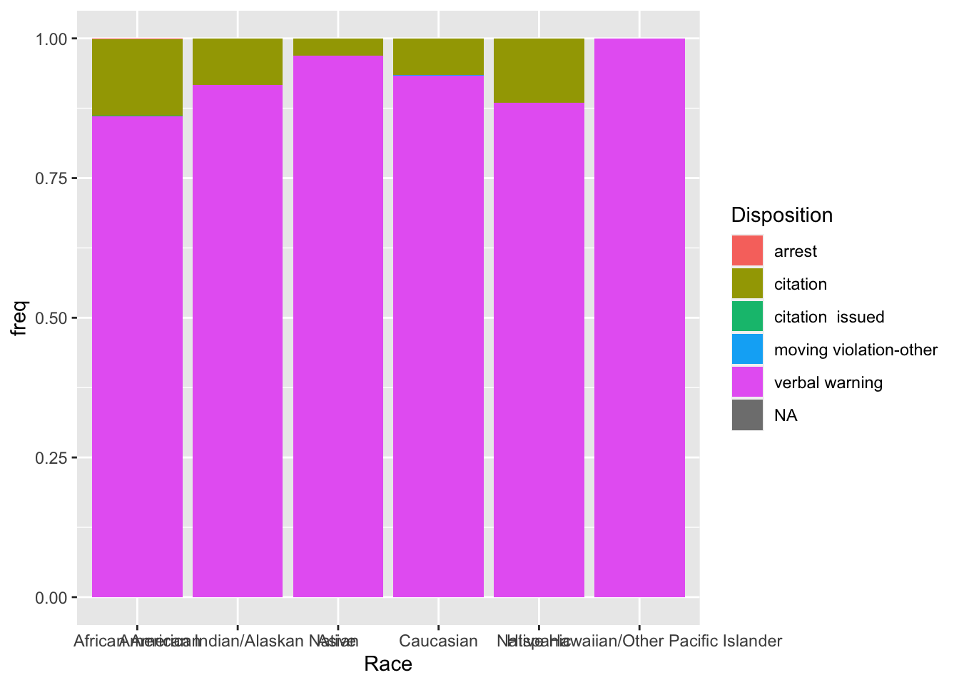 traffic_stop_freq_badNow we want to go a step further. Do outcomes differ by race? In the first code block below, I provide code so you can visualize disposition by race. “Disposition” is police jargon that means the current status or final outcome of a police interaction.