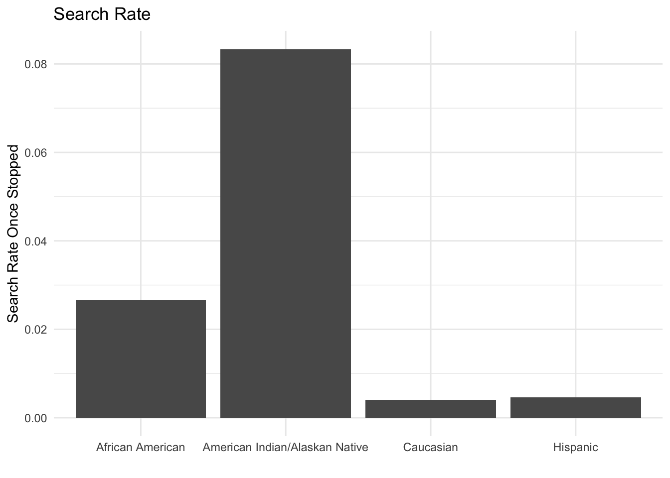filter(n > 5, Disposition == "citation")to the code. What is the impact of filtering based onn > 5? Would you make the same choice? This question doesn’t have a “right” answer. You should try different options and reflect.Now, you can create a similar plot based called “Search Rate” using the Search variable. Write code to re-produce this plot.
