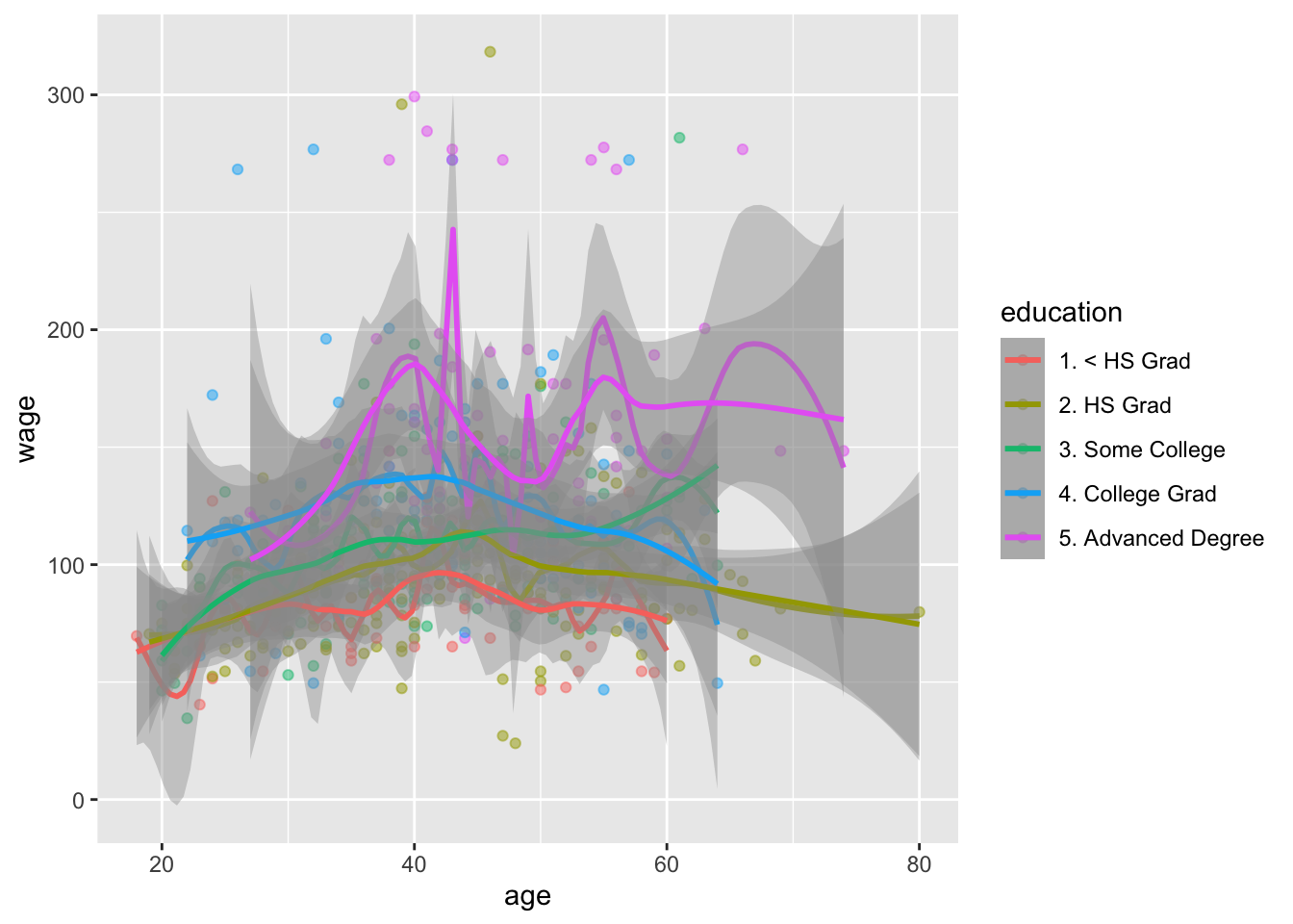 ggplot(wage_data[test,], aes(x = age, y = wage, color = education)) +