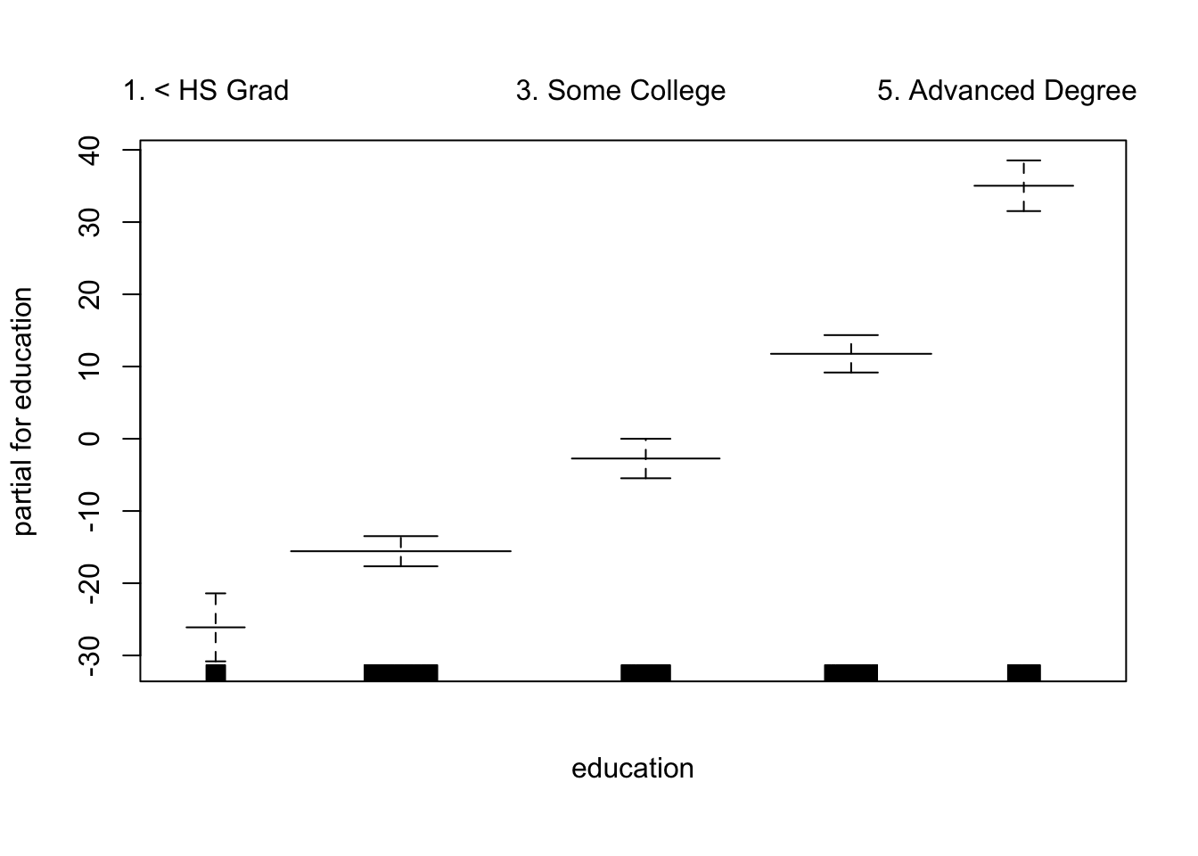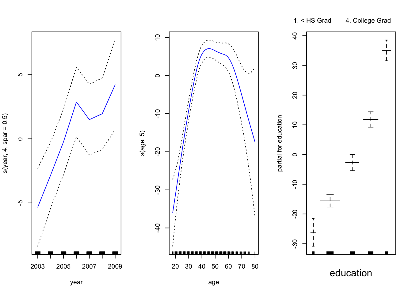 gam_smooth <- gam(wage ~ s(year, 4, spar = 0.5) + s(age, 5) + education,