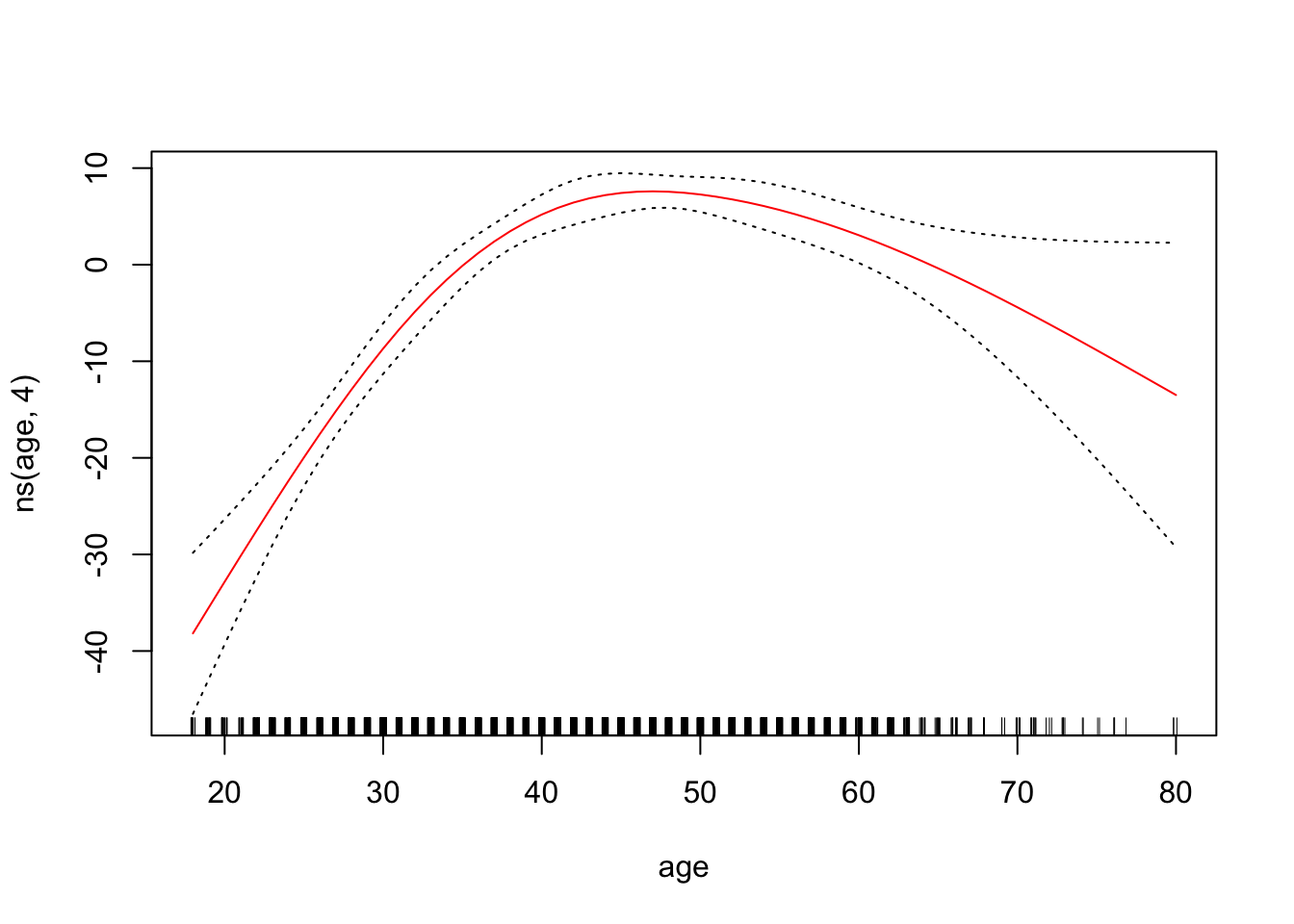 ns_age_poly <- lm(wage ~ ns(age, df = 4), data = wage_data[train,])