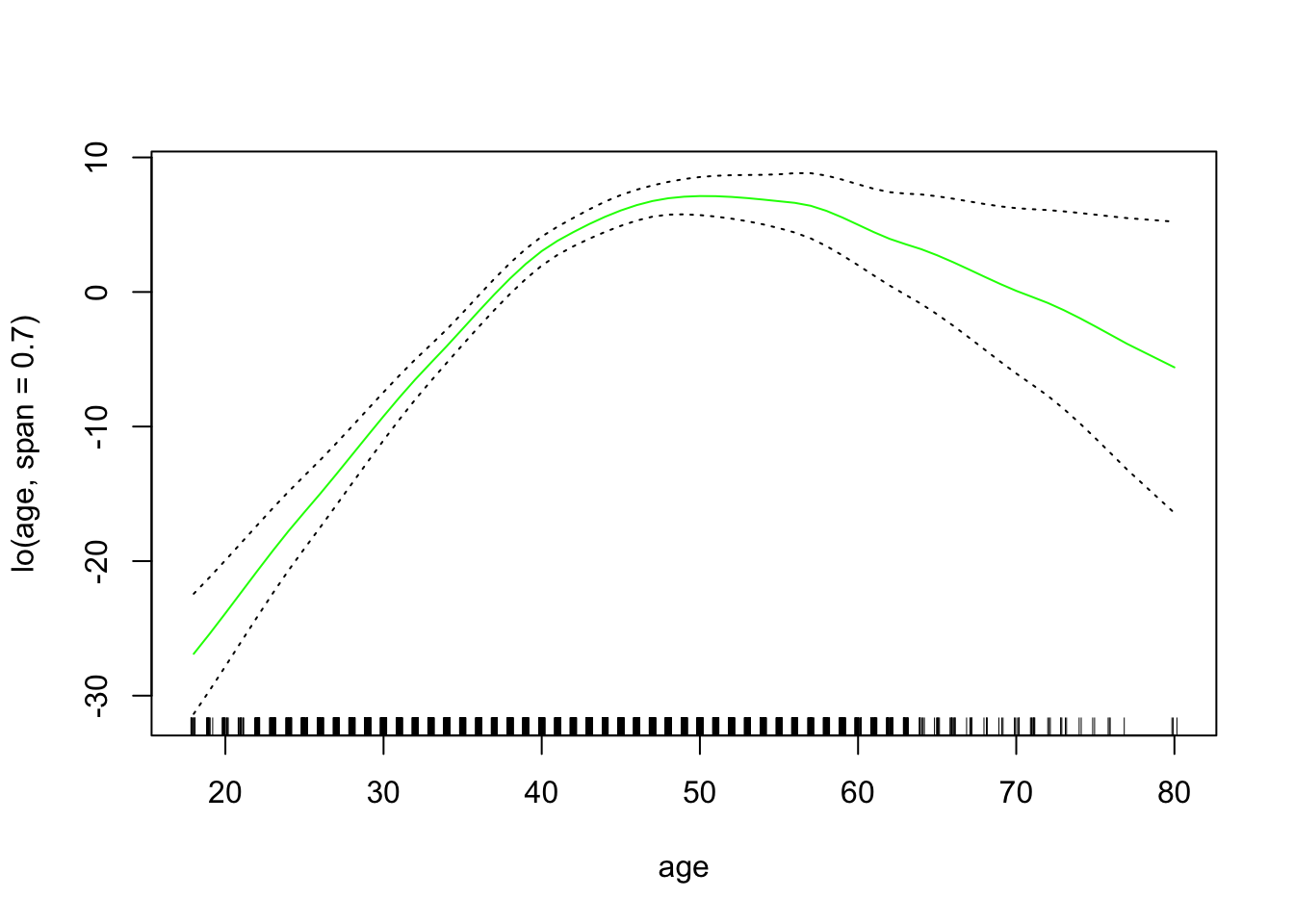 gam_lo <- gam(wage ~ s(year, df = 4) + lo(age, span = 0.7) + education,