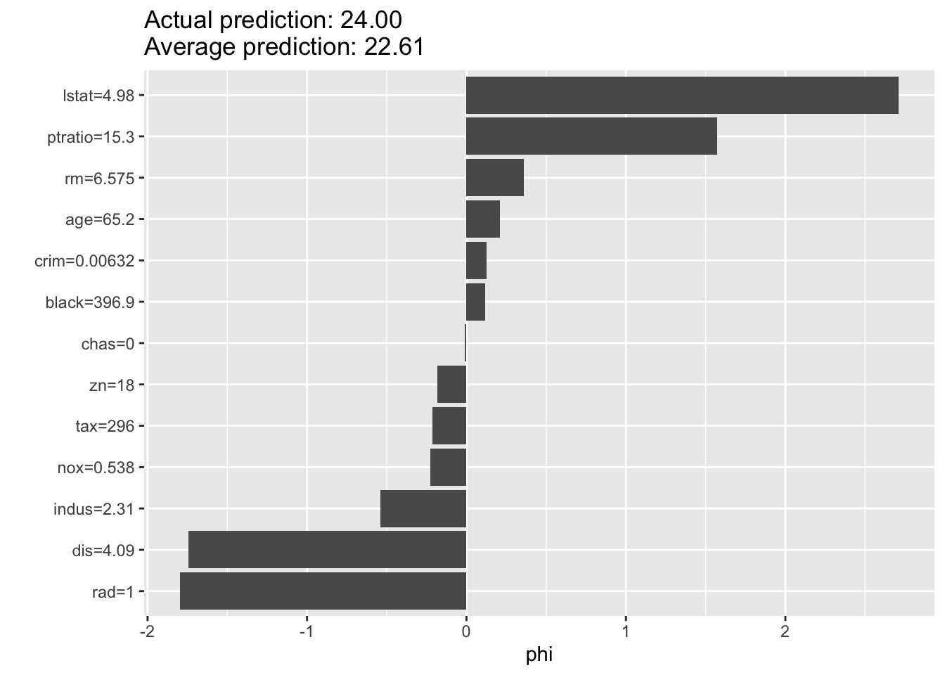 shap <- Shapley$new(predictor, x.interest = boston_data[train[1], -which(names(boston_data) == "medv")])Using 5000 trees...