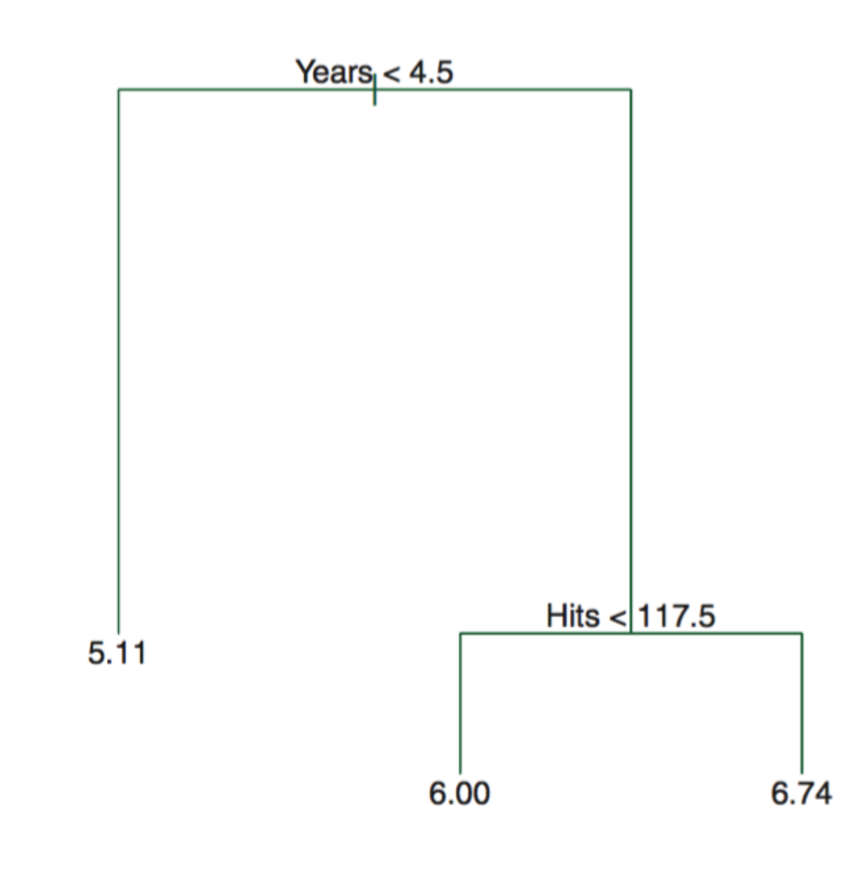 To interpret a decision tree, suppose we have below tree from the Hitters data. The Figure represents a regression tree for predicting the log salary of a baseball player, based on the two predictors—the number of years that he has played in the major leagues and the number of hits that he made in the previous year. We can read the tree sequentially from top to bottom. At a given node (where the branches split), the label (of the form \(X_j < t_k\)) indicates the left-hand branch emanating from that split, and the right-hand branch corresponds to \(X_j \geq t_k\). For instance, the split at the top of the tree results in two large branches. The left-hand branch corresponds to \(Years < 4.5\) and the right-hand branch corresponds to \(Years \geq 4.5\). The number in each leaf (terminal nodes) is the mean of the response (outcomes) for the observations (in the training data) that fall there.