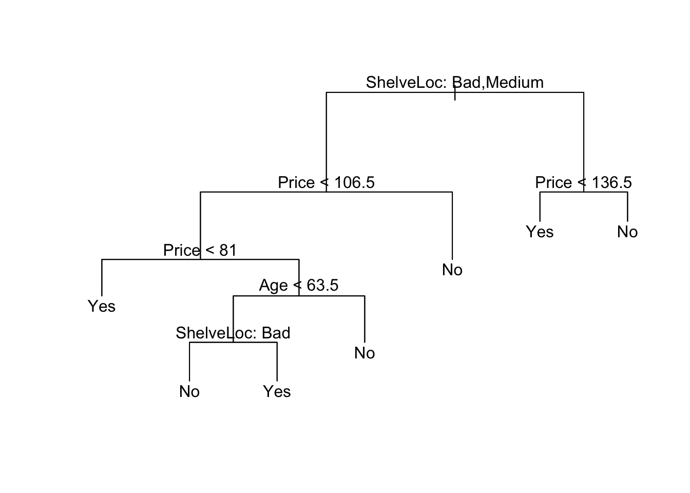 test <- which(!(seq(nrow(carseat_data)) %in% train))We can now train a decision tree using the function tree()