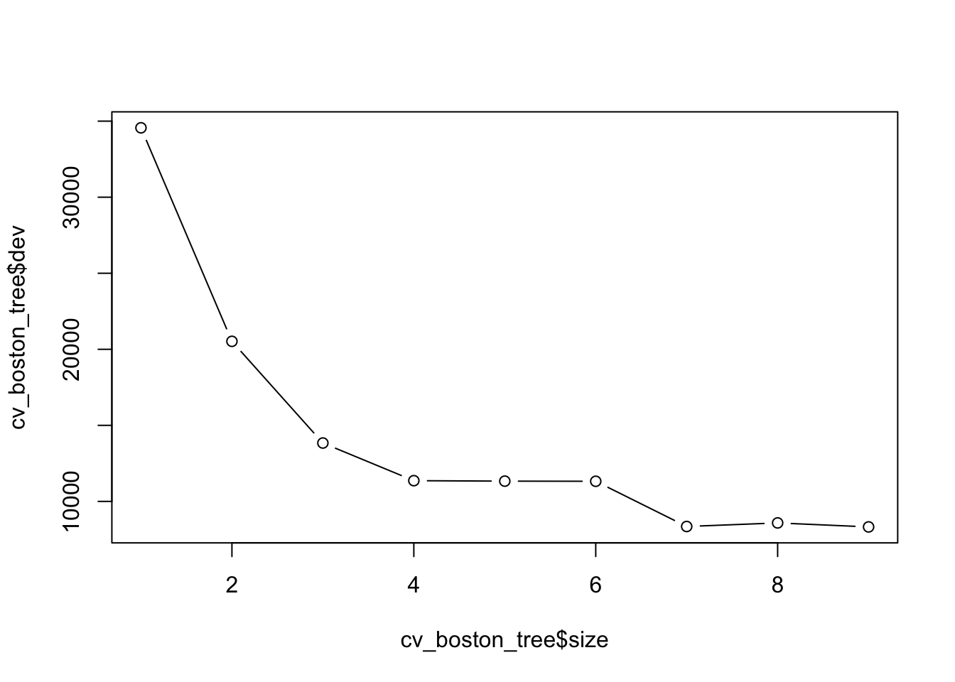 plot(cv_boston_tree$size, cv_boston_tree$dev, type = 'b')