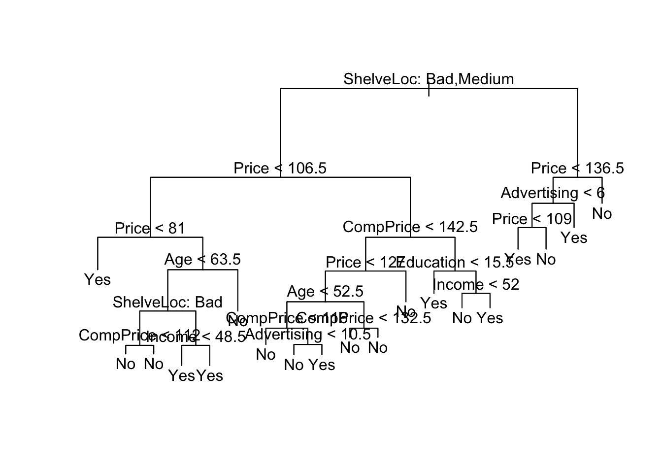 We will use the Carseats data. Sales in this data set is a continuous variable. We start by converting it to a binary one that equals “Yes” if Sales \(> 8\) and “No” otherwise.