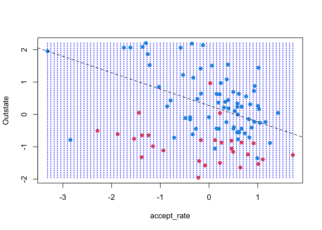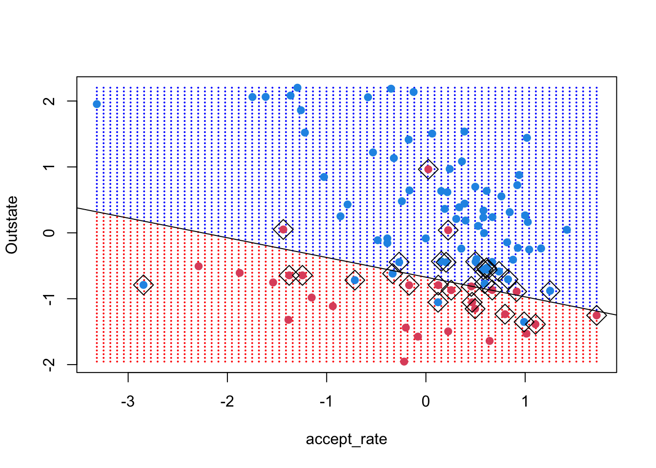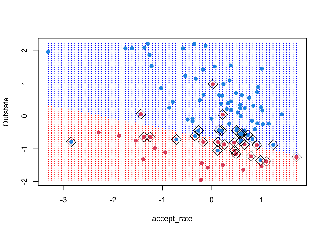 college_svm1 <- svm(Private ~ Outstate + accept_rate,