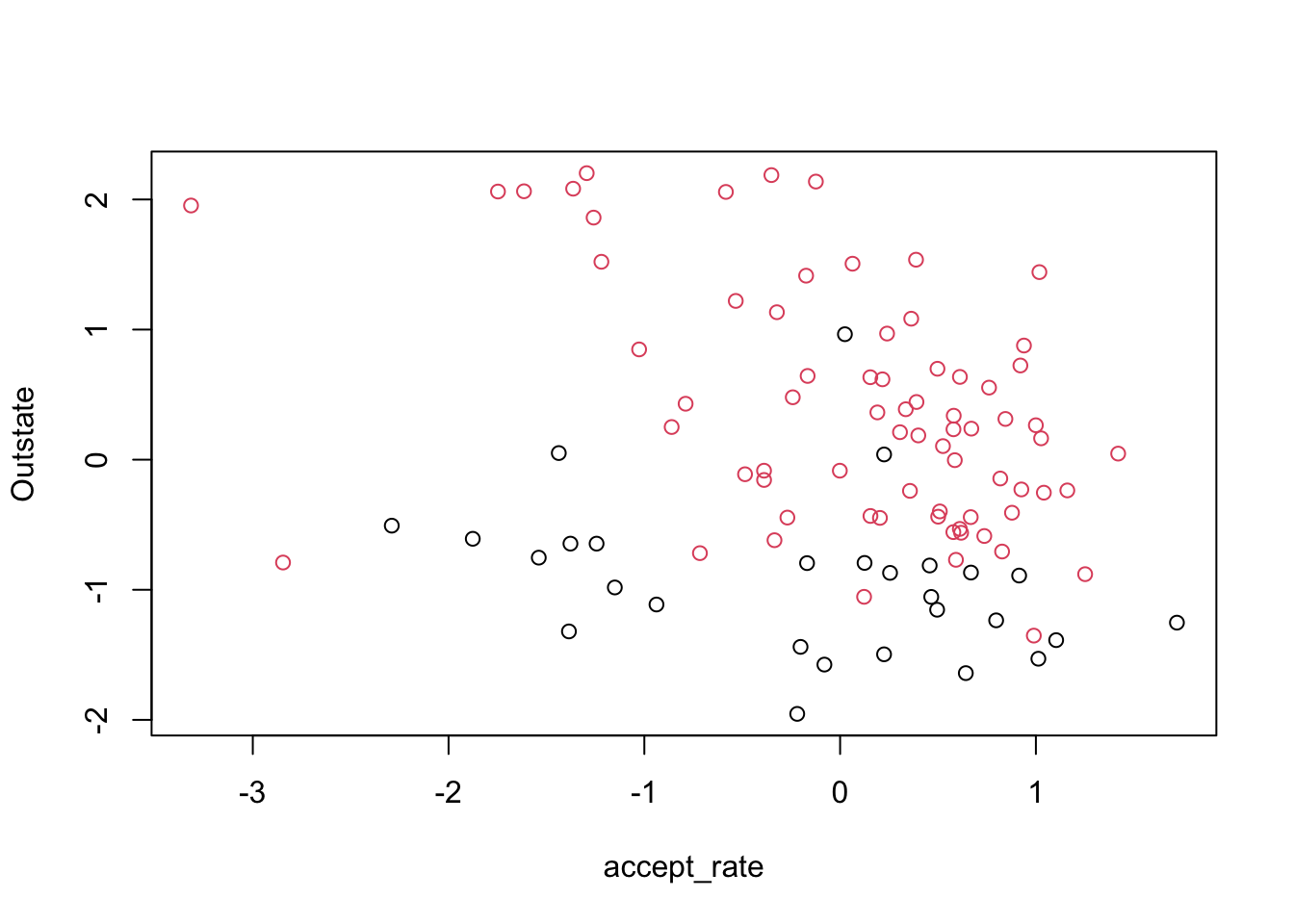 select(accept_rate, Outstate, Private)The svm function will have a hard time unless we scale our data. There is an option to scale within the svm() function that is perfectly sufficient when training a model. However, we will be doing a lot of visual inspection, so it will help to have our raw data scaled for these exercises.
